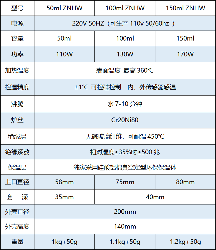 ZNHW型电热套是用无碱玻璃纤维作绝缘材料,将Cr20Ni80合金丝簧装置于其中,用硅酸铝棉经真空定型的半球形保温体保温,外壳一次性注塑成型,上盖采用静电喷塑工艺,由于采用球形加热,可使容器受热面积达到60%以上。控温采用计算机芯片做主控单元,采用多重数字滤波电路,模糊PID控制算法,具有测量精度高,冲温小,单键轻触操作,双屏显示,内、外热电偶测温,可控硅控制输出,160-240V宽电压电源,并有断偶保护功能,具有升温快、温度高、操作简便、经久耐用的特点,是做精确控温加热试验的最理想仪器。