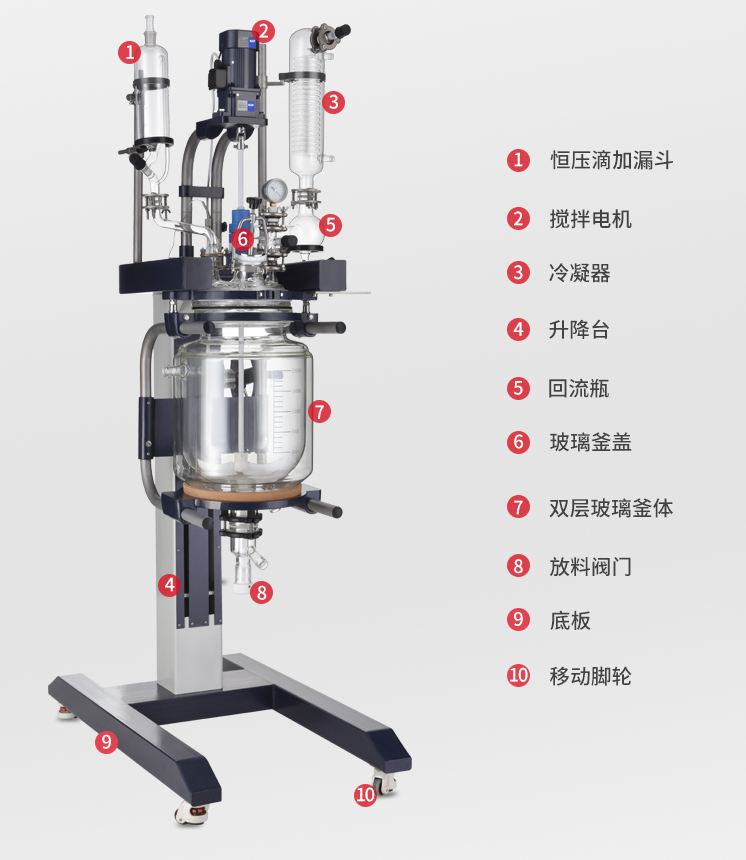 •反应釜釜体采用高硼硅玻璃(GG-17材质),有优良的物理化学性能,瓶体透明、可见反应液料。